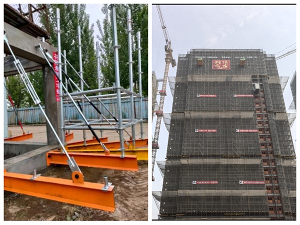 【花籃懸挑腳手架】 本項目外腳手架采用盤扣式花籃懸挑腳手架進行施工,花籃懸挑腳手架使用高強螺栓與結構外立面連接,其上設置拉桿,因形似花籃而得名,與傳統懸挑工字鋼相比,花籃懸挑腳手架顯著節省了鋼材的使用量,重量減輕避免了架體對建筑結構的破壞,由于不需要穿墻安裝,不會損壞混凝土墻、梁、板等結構,有效杜絕了外墻滲水漏水現象,保證了主體結構的施工質量,從源頭上有效防止了滲漏隱患的產生,從根源上解決購房者對懸挑層質量隱患的擔憂。